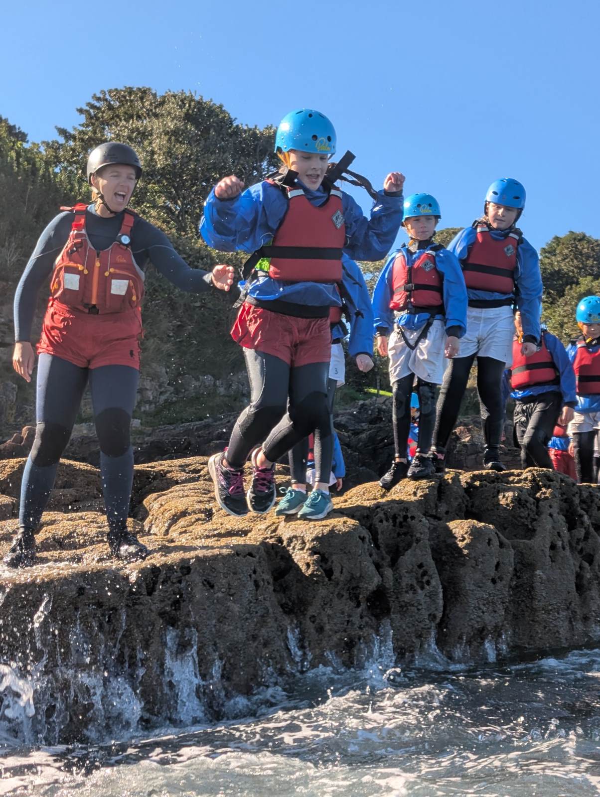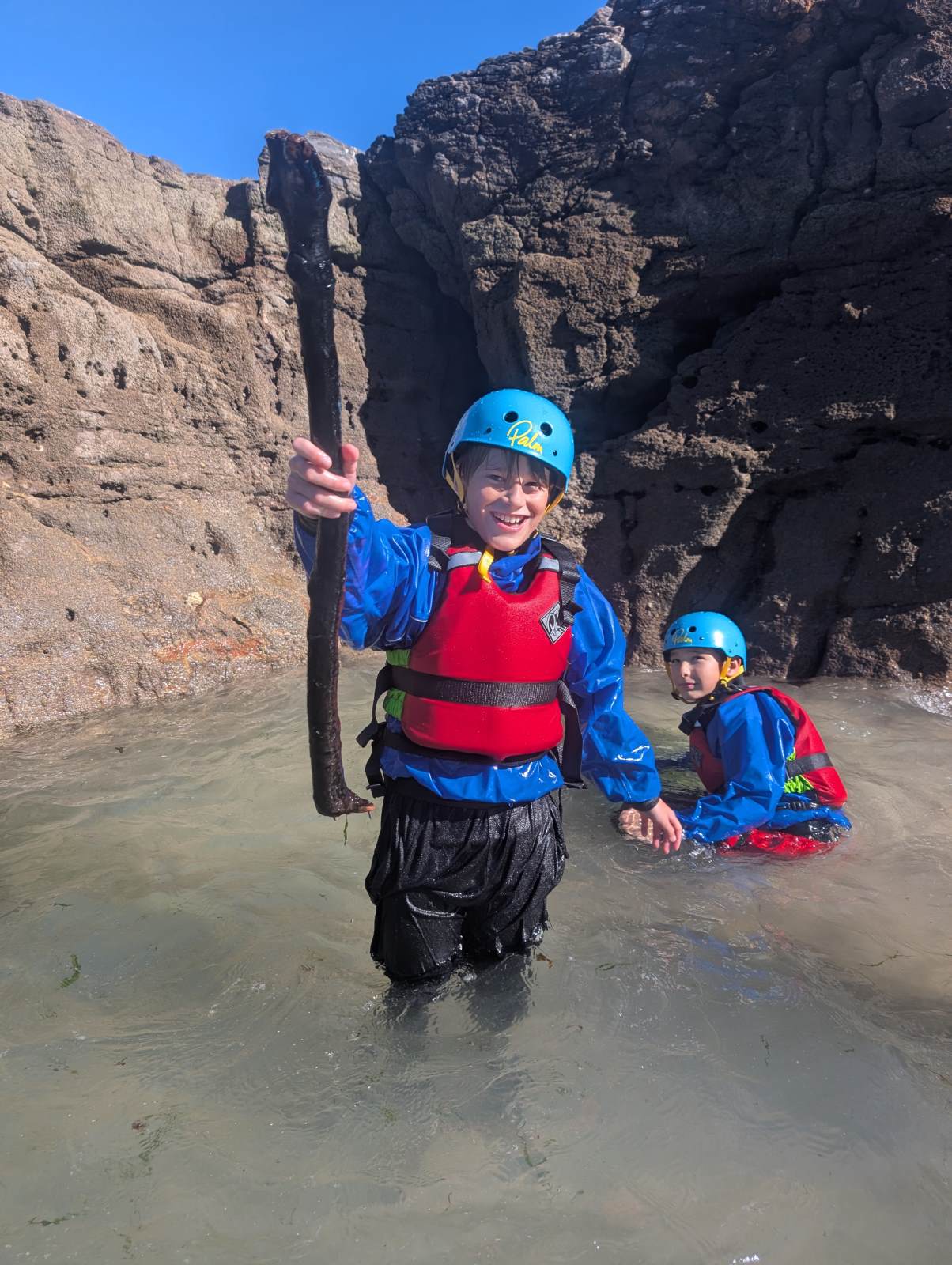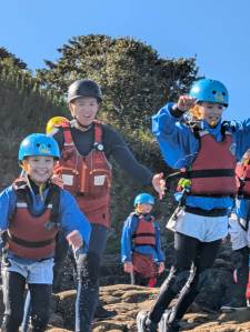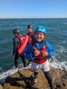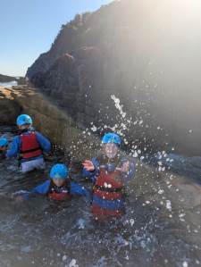 All the children were involved in coasteering this morning, and everyone got involved in jumping into the waves and bobbing around! We then splashed about in a small cove and explored a sea cave. We (and the instructors) were really impressed with the speed at which they were ready and getting through the activity — which meant more time doing the jumps.